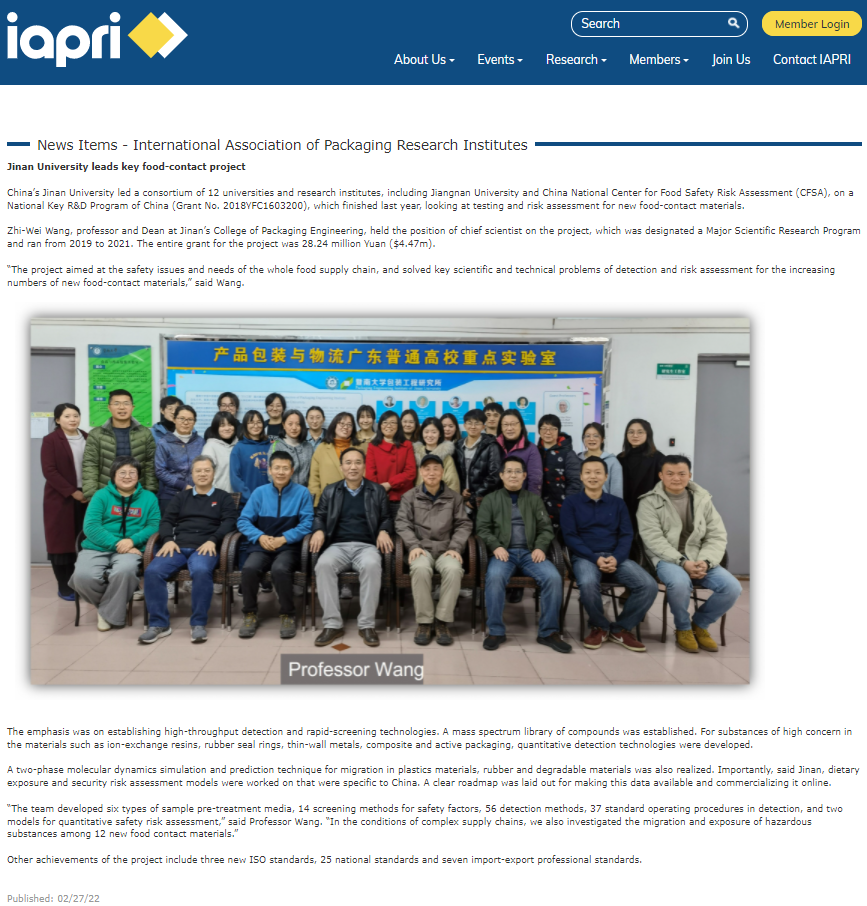 近日,包装学术界和工业界最权威的学术组织国际包装研究联合会(International Association of Packaging Research Institutes,IAPRI)在其官网上,对新葡京博彩官网门户主页 承担的国家重点研发计划项目“进口新型食品接触材料检测与风险评估技术研究”项目成果进行了报道。