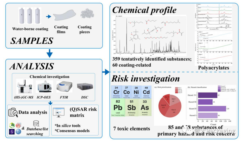 具体上,我们研究了三种具有不同组成的水性涂料样品。通过傅里叶变换红外分光光度计 (FTIR) 和差示扫描量热法 (DSC) 分析,聚丙烯酸酯为涂层样品的主要成分。通过电感耦合等离子体发射光谱法 (ICP-OES) 测定涂层样品中含有23种元素,其中有 7 种的峰值超过特定的迁移限值,证明水性涂料可能受到重金属污染。在359种初步确定的物质中,分别有85种和38种物质被归类为危险Ⅳ和风险Ⅳ,表明这些物质的安全问题需引起特别关注,这些物质可能来自工业加工过程中的分解产物和杂质。总的来说,了解污染物的特性将有助于更容易地找出可能的污染源,并可研究修改水性涂层纸的生产工艺来降低受污染的风险。