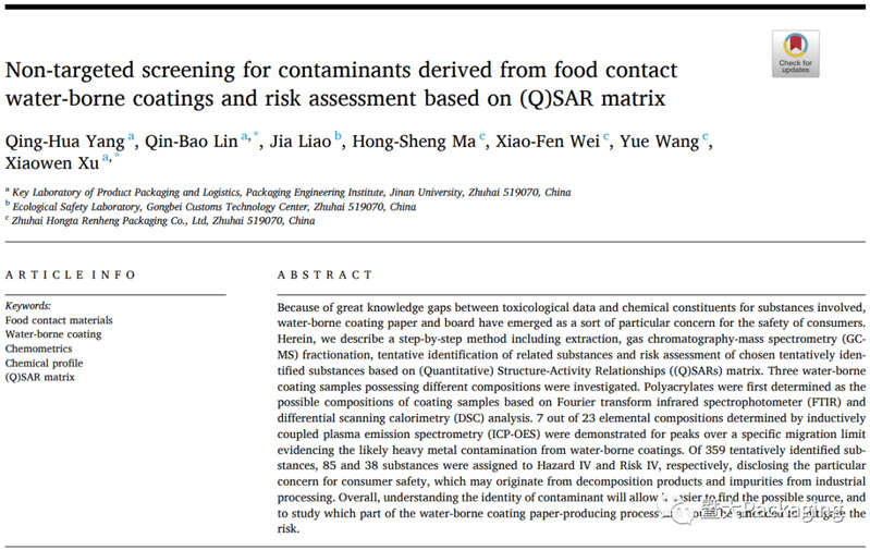 近日,新葡京博彩官网门户主页 徐晓文副教授和林勤保研究员指导的硕士二年级学生杨青华为第一作者完成的研究论文 Non-targetedScreening for Contaminants derived from Food ContactWater-borne Coatings and Risk Assessment Based on (Q)SAR Matrix 在国际著名期刊 Food Packaging and Shelf Life(影响因子=8.7,SCI 一区)正式发表。该刊物为食品安全领域国际顶尖杂志,在国际食品安全研究领域有重要影响。该文章获得广东省基础与应用基础项目,以及珠海市进出口公共技术服务平台产学研协同创新项目的资助。