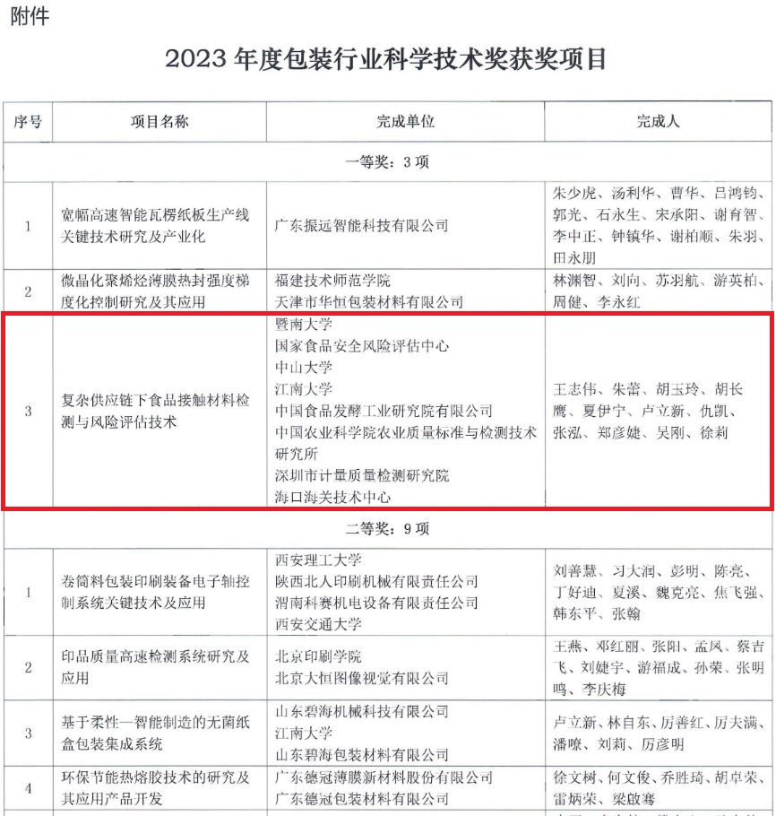 近日,新葡京博彩官网门户主页 王志伟教授牵头完成的项目《复杂供应链下食品接触材料检测与风险评估技术》获中国包装行业科学技术最高奖——2023年度包装行业科学技术奖一等奖。该项目组自2003年起在国内率先研究食品包装材料中化学物的迁移和安全问题,近年完成了一系列的国家重大项目,组织和整合国内高校、风险评估机构、海关、质检、企业的食品接触材料安全领域技术队伍,开展合作研究和协同攻关,取得了系统性的创新成果,开辟了食品包装安全新领域。项目针对复杂供应链下食品接触材料安全重大问题和需求,研究解决食品接触材料检测与风险评估的关键科学和核心技术问题,为保障食品接触材料安全和食品安全提供重要的理论和技术支撑。