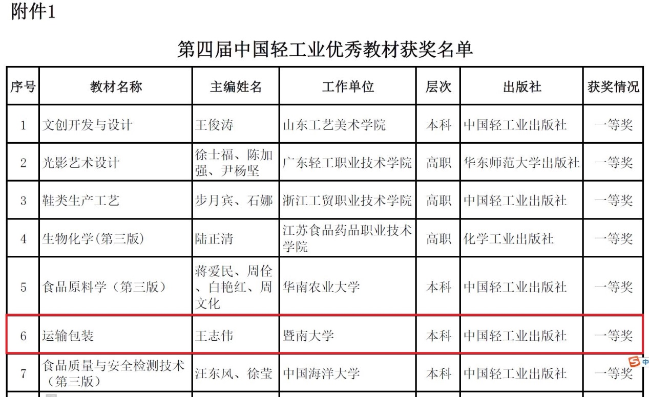 2023年3月,新葡京博彩官网门户主页 王志伟教授编著的《运输包装》(中国轻工业出版社出版)获中国轻工业教材最高奖——第四届中国轻工业优秀教材一等奖。该教材在全国高校包装工程及相关专业得到广泛使用,是国家级一流本科课程“运输包装”(线下一流课程和线上一流课程)和中国大学MOOC课程“运输包装”的指定教材。
